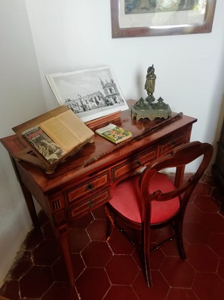 un capezzale in avorio e madreperla.Su uno scrittoio,
